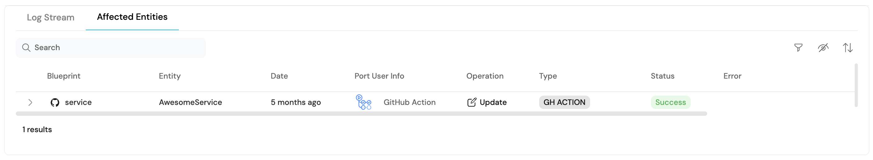 Now when you look at the action run page in Port, you will see the new Entity listed under the Affected Entities tab: