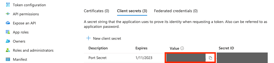 Be sure to mark on your calendar the expiration date of the secret. The secret needs to be replaced before its expiration, otherwise login to Port will be disabled.